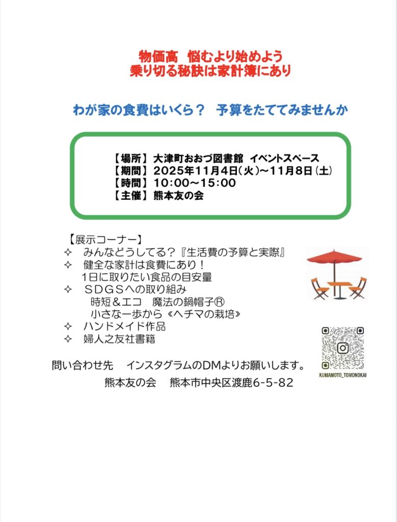 2025年10月6日 / 最終更新日時 : 2025年10月10日 Kumatomo イベント おおづ図書館の家事家計講習会のお知らせ11月4日(火)〜11月8日(土)大津町おおづ図書館で家事家計講習会を行いますご来場をお待ちしていますScreenshot