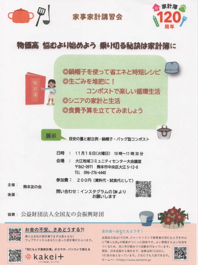 2025年10月12日 / 最終更新日時 : 2025年10月12日 Kumatomo イベント 大江コミュニティーセンターの家事家計講習会のお知らせ11月18日(火)10:00〜11:30大江地域コミュニティセンターで家事家計講習会を行いますご来場をお待ちしています
