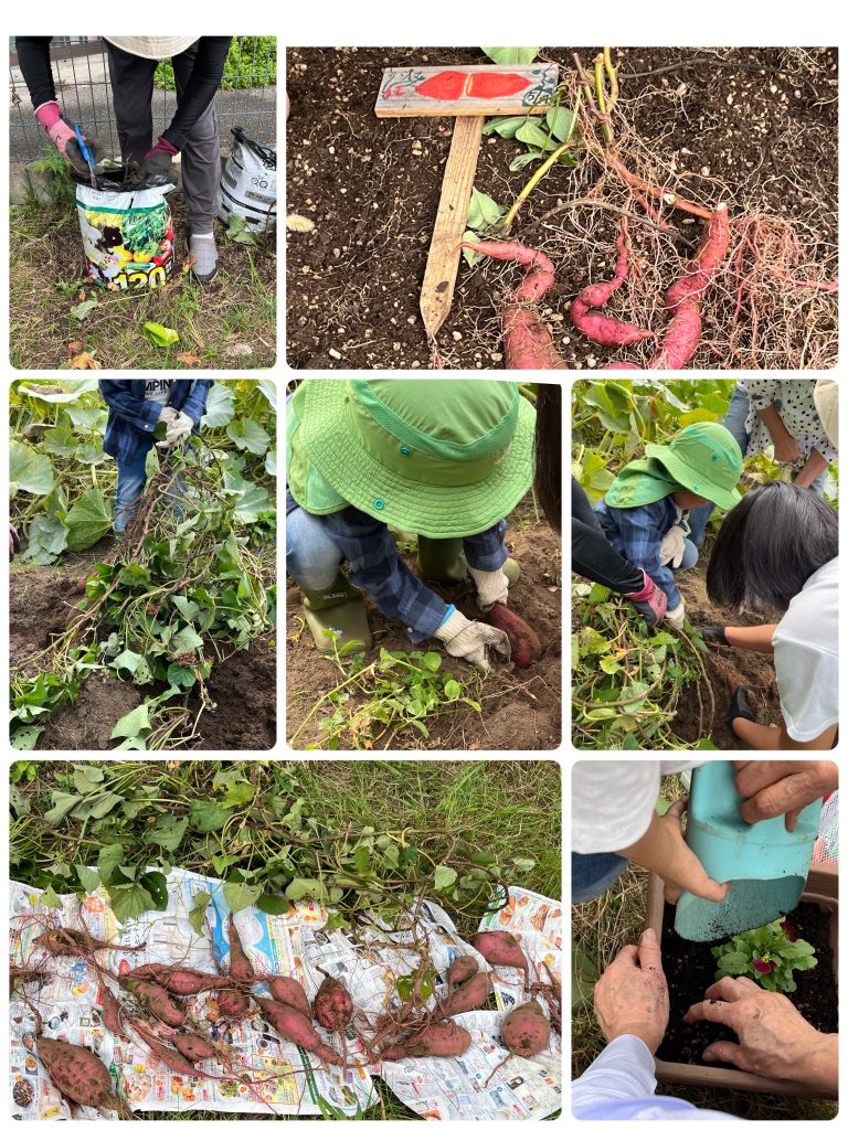 10月18日のこどもひろばは,幼児と小学生2人の参加でした。まず5月に植えたさつまいもの収穫…ツルを引っ張り,芋が無かった様に見えても土を掘っていると大きいのが出てきてびっくりしながら、硬く埋まっているのを一生懸命掘り出しました🍠 培養土の袋の中に植え付けたさつまいもはどうなっているか興味津々‥色々な形に驚きながら,袋の中でも育つことがわかりました.