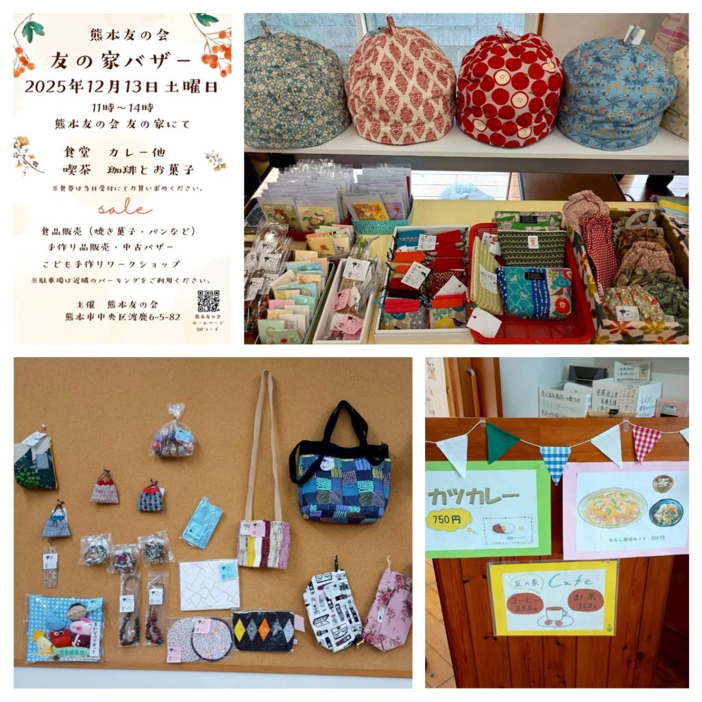 12/13(土)に開催した友の家バザーは、会員で協力し合ってたくさんの手作り製品を準備しお客様をお迎えすることができました。ご来場くださった皆さま、ありがとうございます。来年も趣向をこらして地域の皆様にも会員にも楽しいバザーを開催したいと思っています。